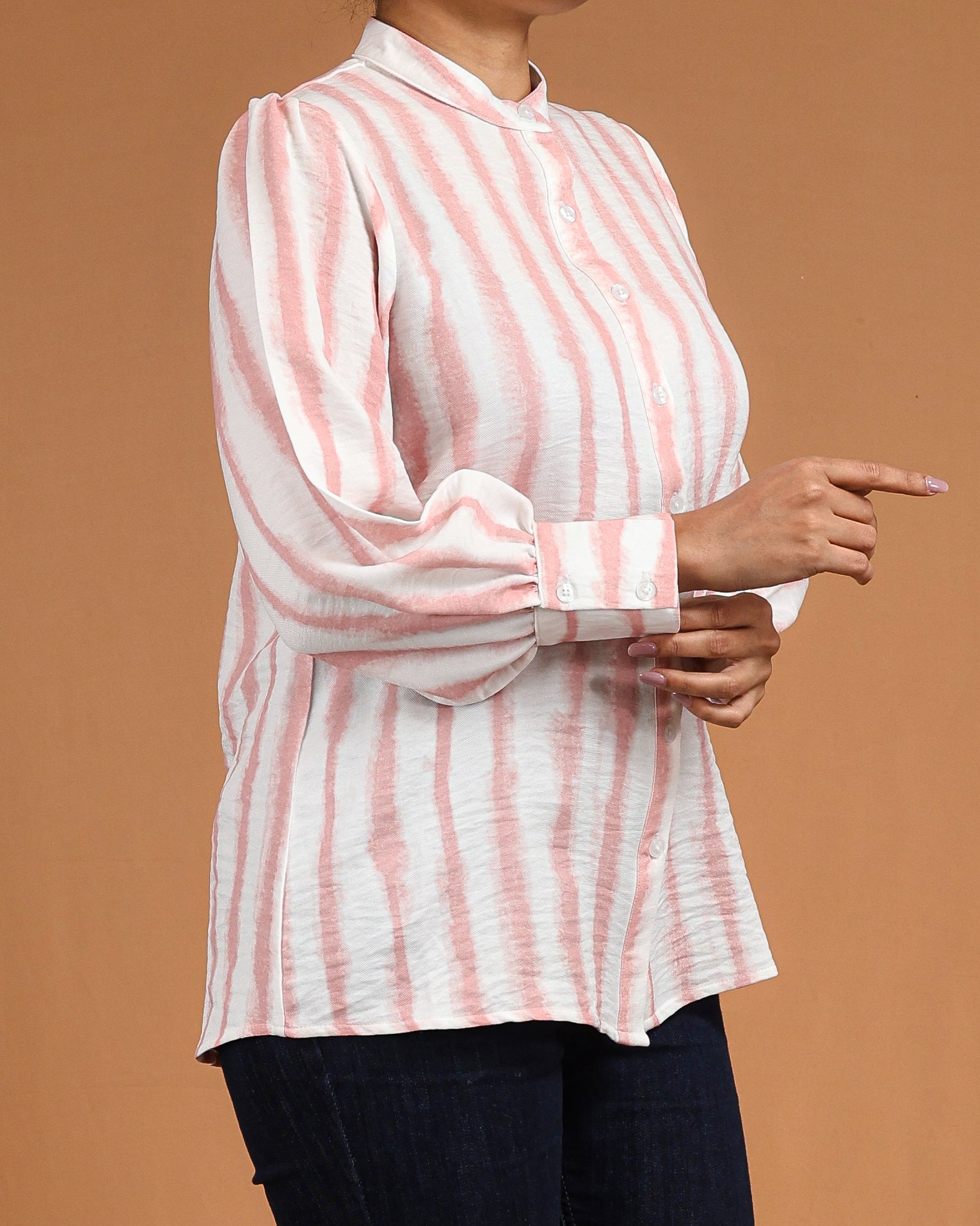 A soft blush-striped shirt dress featuring a textured finish and a clean, tailored silhouette. The button-down front and subtle puff sleeves add a refined touch while keeping the look effortlessly fresh.