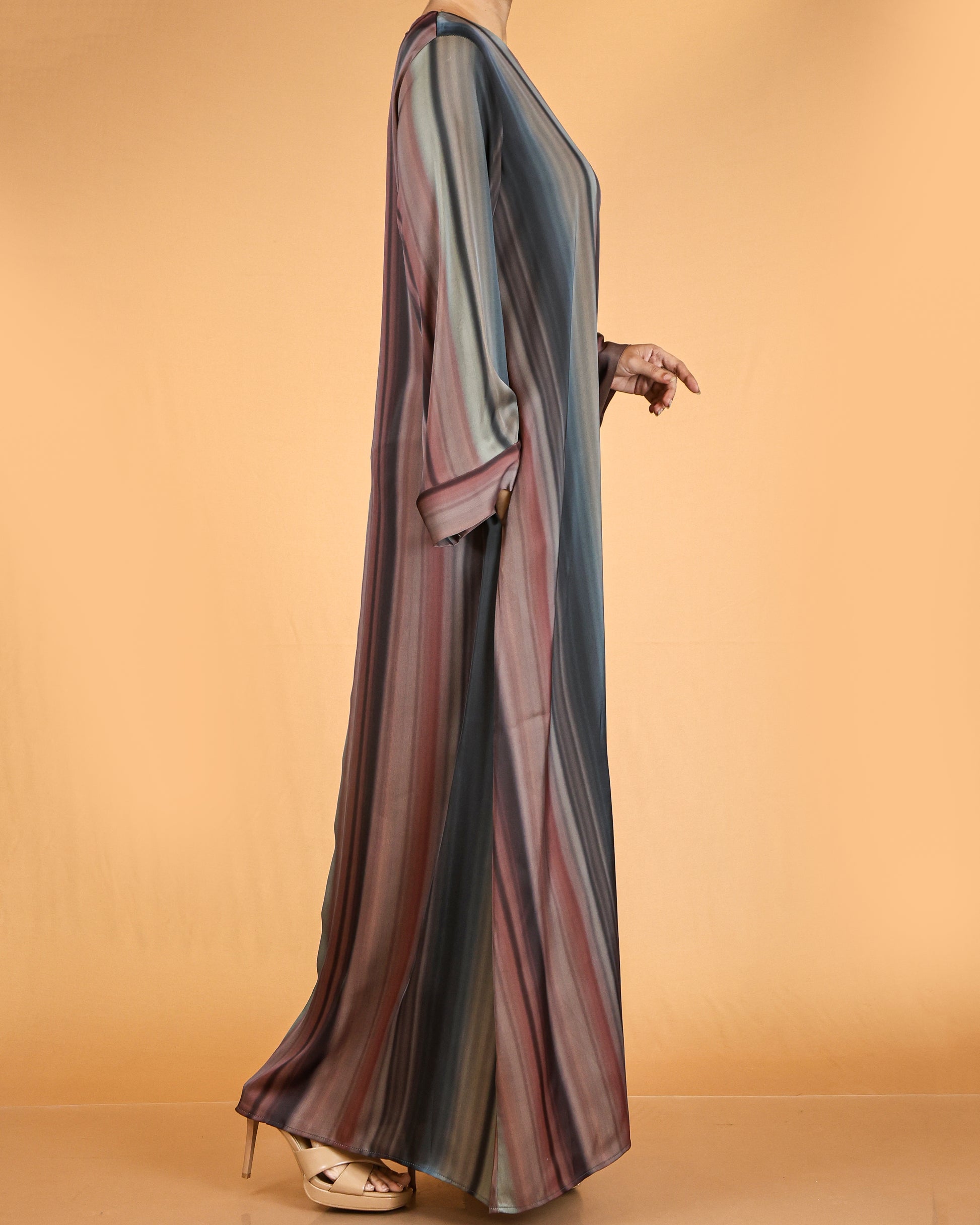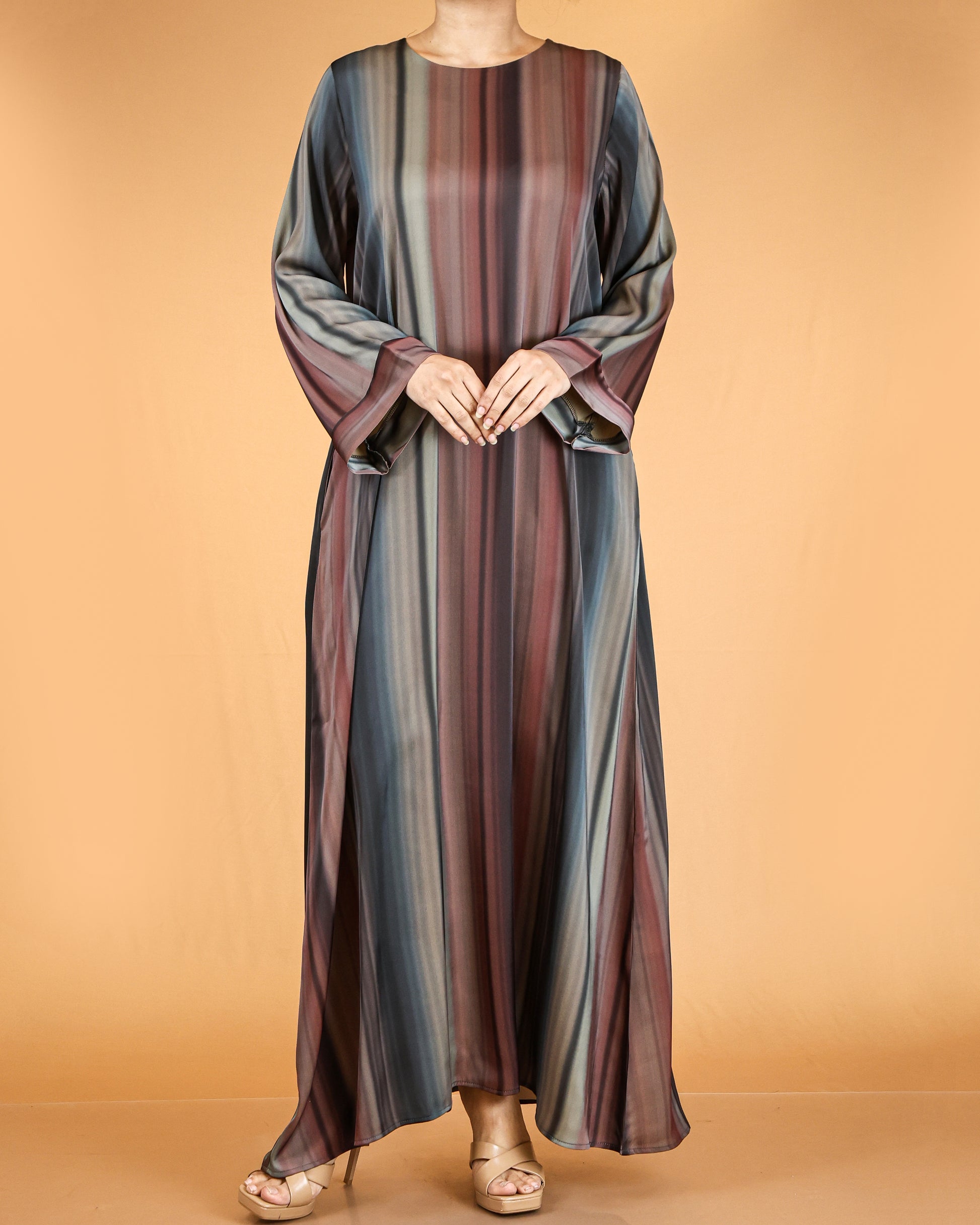 Experience effortless elegance with this flowy maxi dress, designed with a relaxed fit and graceful movement. The subtle striped pattern adds a touch of sophistication, while the long sleeves and round neckline create a modest yet stylish look. Perfect for both casual outings and special occasions, this piece blends comfort with timeless charm.