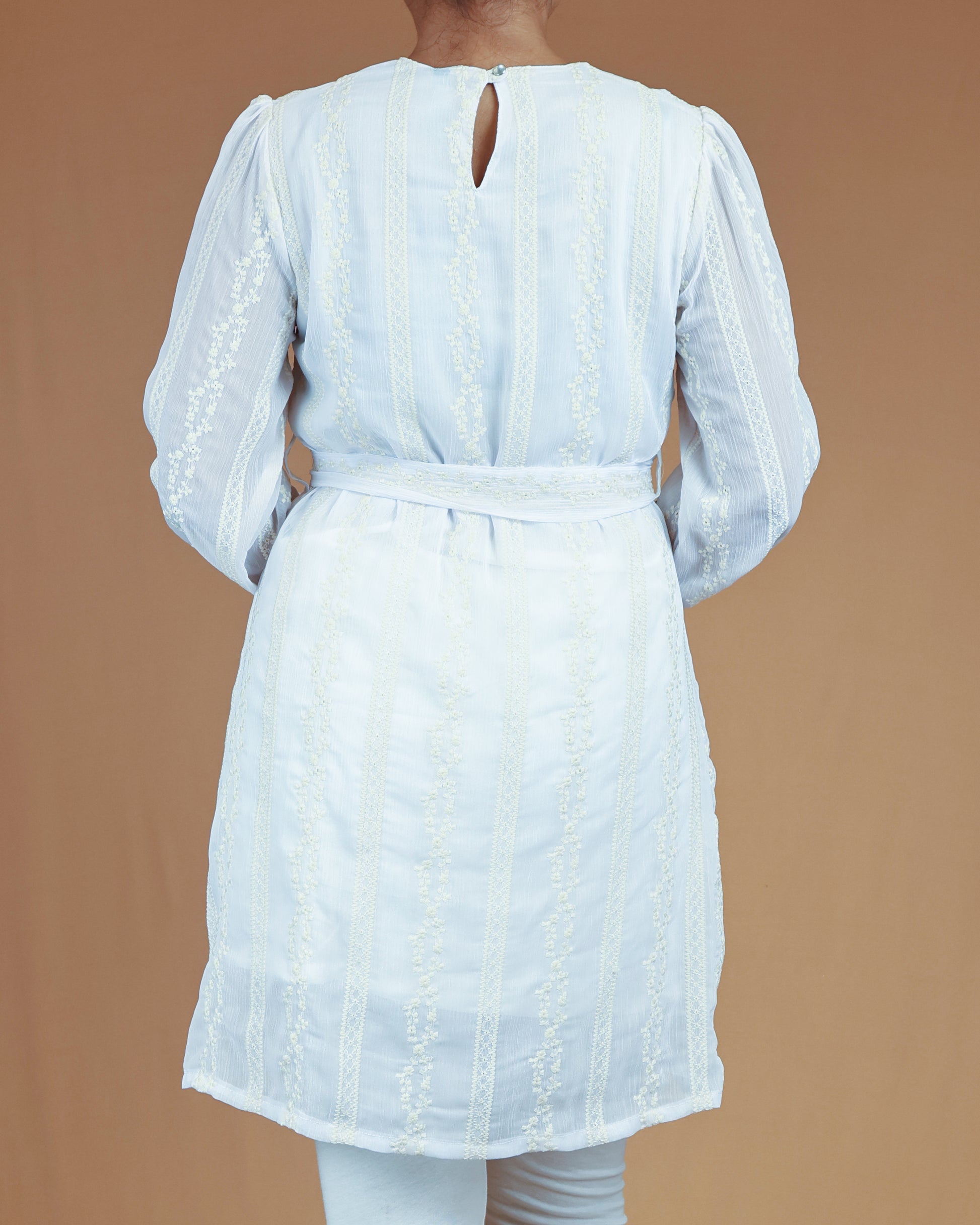 Soft frosted pearl base detailed with delicate vertical embroidery. Designed with a classic round neckline and sheer long sleeves with elastic cuffs.