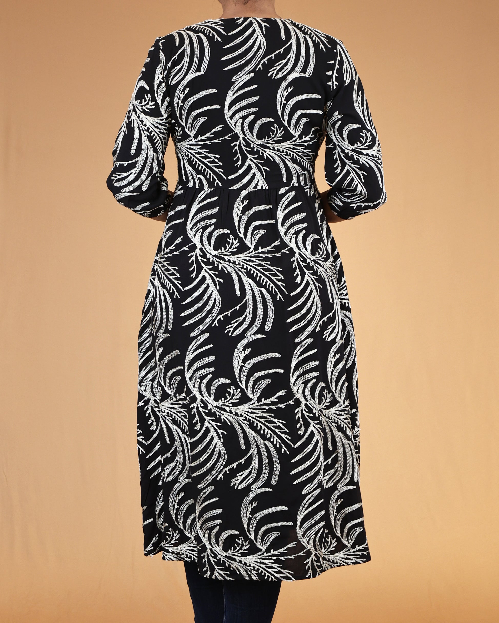 This midnight noir midi dress features a rich black base highlighted with delicate ivory botanical embroidery. The deep, inky tone adds a refined, high-end feel to the silhouette.