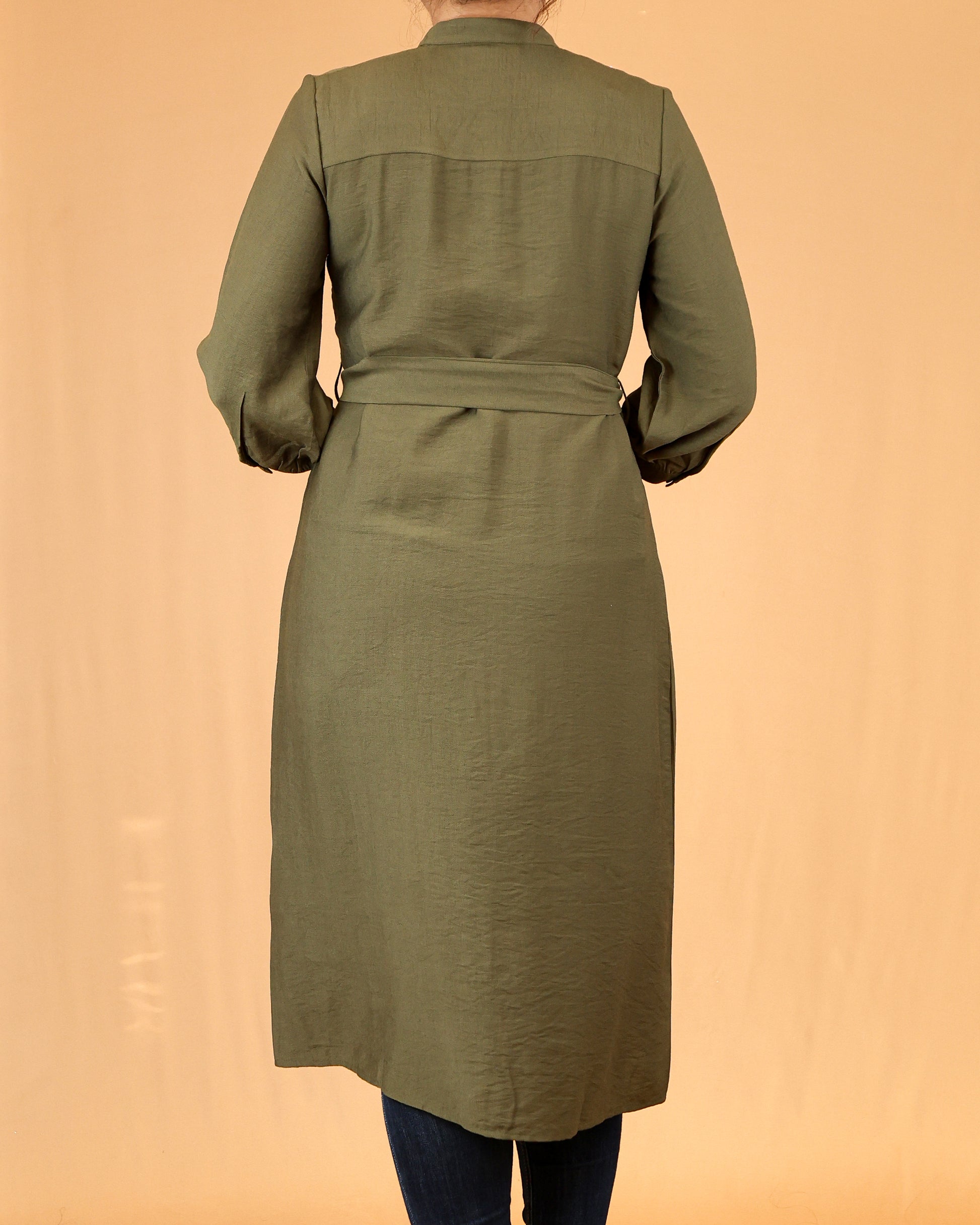 This olive green shirt dress features a refined mandarin collar and a clean button-down front. The waist tie belt adds a flattering touch while keeping the silhouette modest.