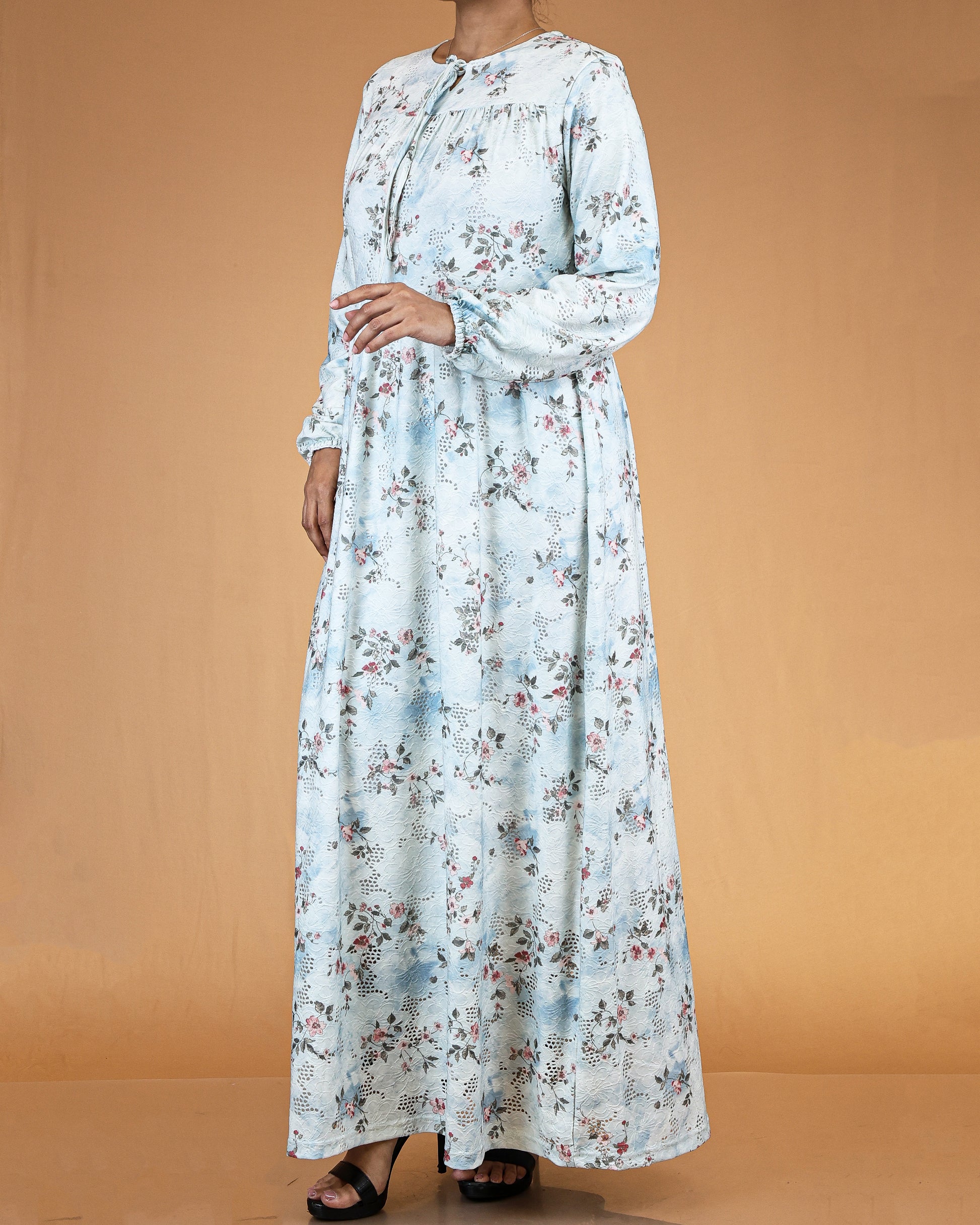 This pastel blue abaya maxi features a soft lace-textured base with delicate floral detailing for a refined, airy finish. The light blue tone keeps the look elegant, calm, and timeless.