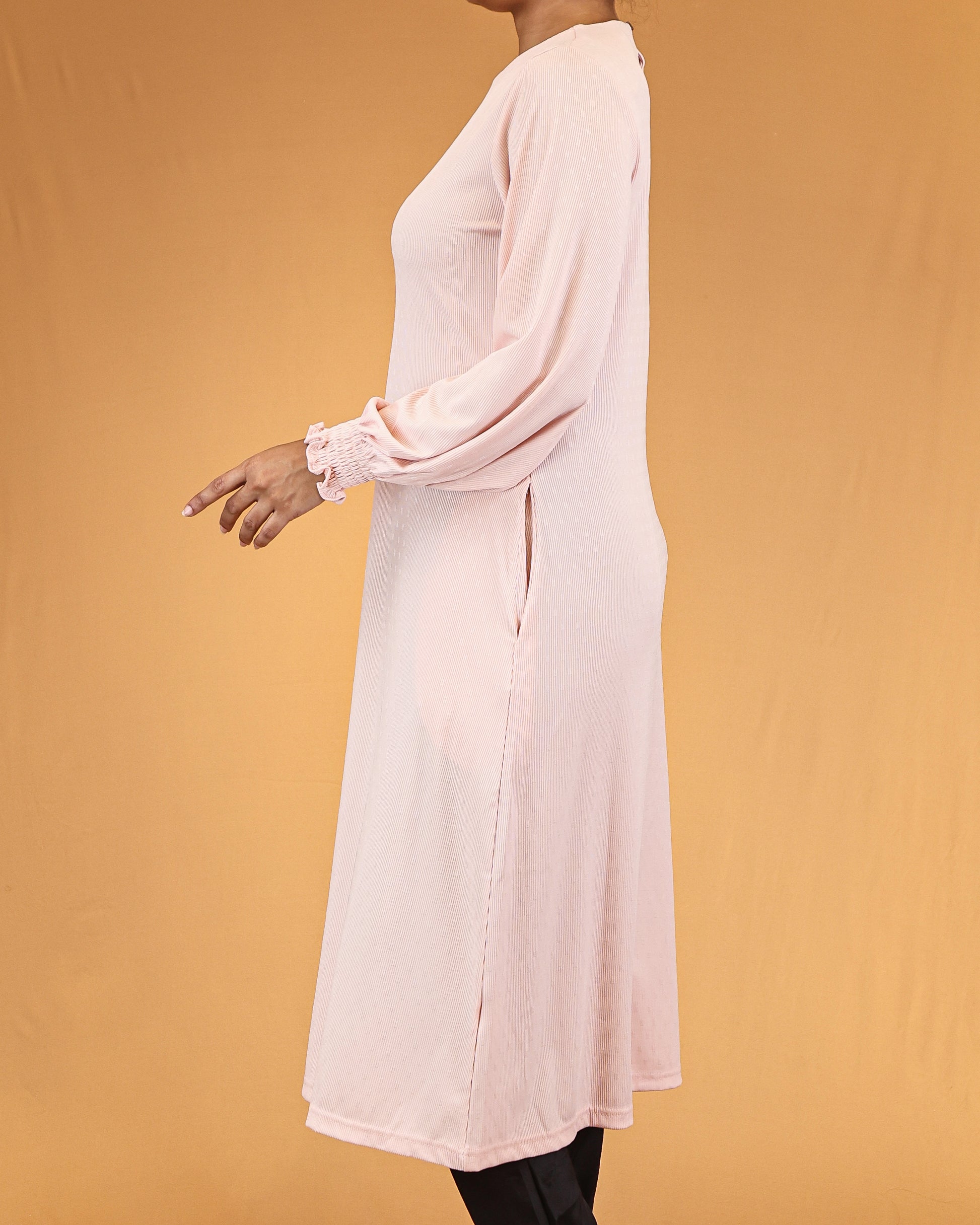Crafted in a soft blush tone with a refined vertical texture and a clean round neckline. The straight-cut silhouette offers a smooth, elegant fall with a modern minimal feel.