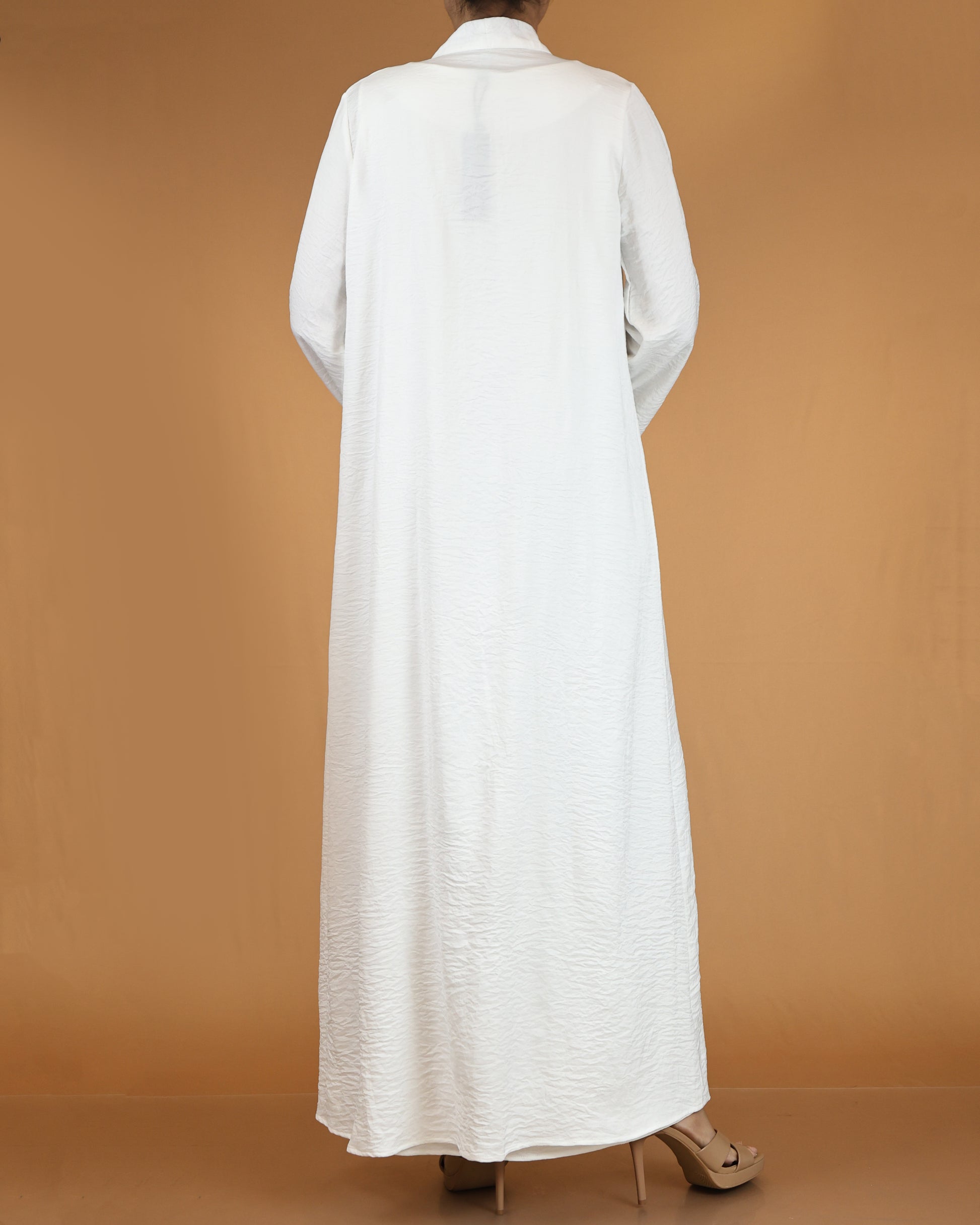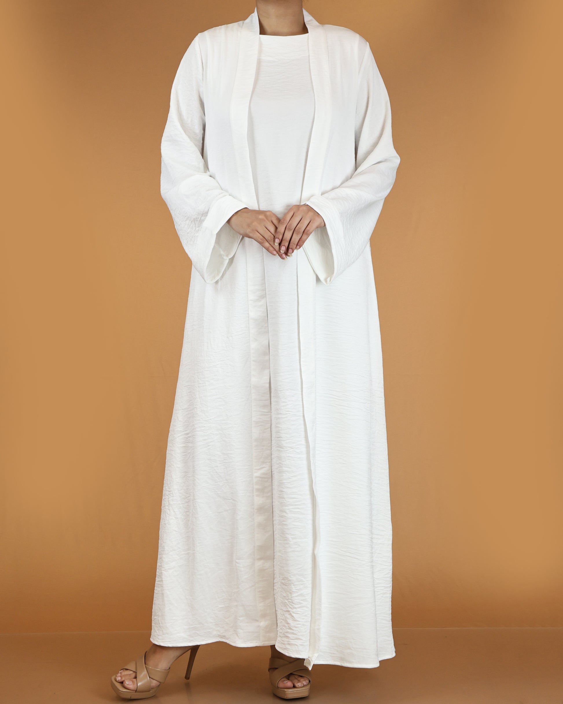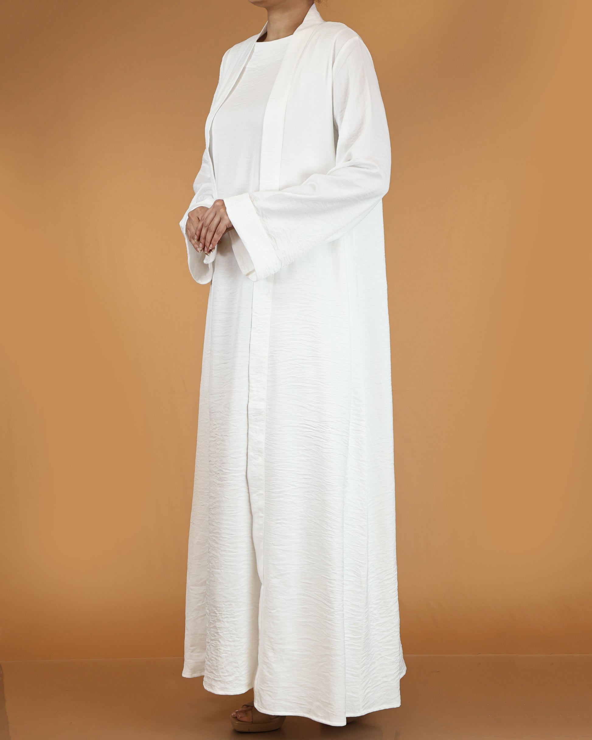 Redefine elegance with this textured two-piece maxi set, featuring a flowy inner dress paired with a matching open-front overlay. Designed for comfort and sophistication, the relaxed silhouette moves beautifully with every step. Perfect for both everyday wear and special occasions, this set offers versatile styling in a timeless design.